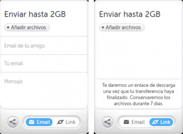 WeTransfer es una herramienta que permite enviar archivos pesados de forma muy sencilla. No es necesario registrarse ni siquiera descargarse la aplicación. En su versión gratuita permite enviar 2GB y en la versión de pago 20GB.